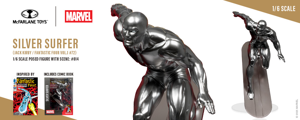 高い造形力とクオリティーに定評のあるマクファーレン・トイズが、『マーベル・コミック』を待望の立体化!名作カバーアートを立体化する1/6スケール「シーン・フィギュア」より、シルバーサーファー(ジャック・カービー/Fantastic Four Vol.1 #72)が登場だ!