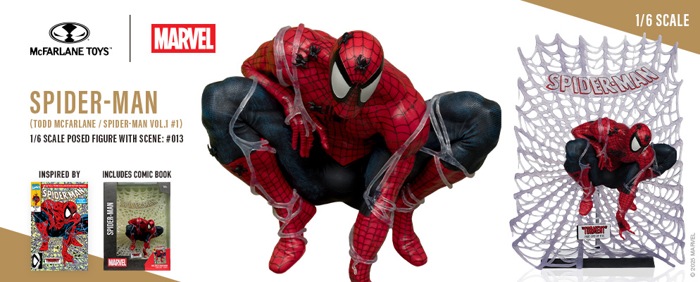 高い造形力とクオリティーに定評のあるマクファーレン・トイズが、『マーベル・コミック』を待望の立体化!名作カバーアートを立体化する1/6スケール「シーン・フィギュア」より、スパイダーマン(トッド・マクファーレン/Spider-Man Vol.1 #1)が登場だ!