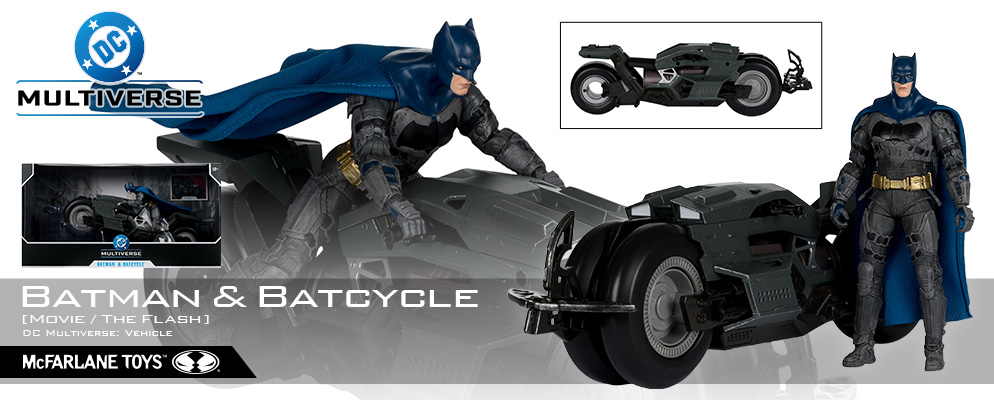 高い造形力とクオリティーに定評のあるマクファーレン・トイズがお贈りする、7インチ・アクションフィギュア「DCマルチバース」シリーズ。映画『ザ・フラッシュ』より、バットマン&バットサイクルがラインナップ!