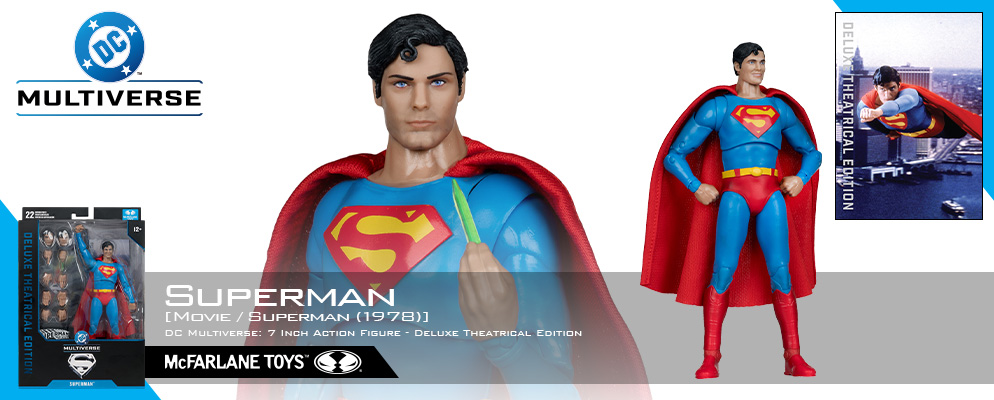 高い造形力とクオリティーに定評のあるマクファーレン・トイズがお贈りする、7インチ・アクションフィギュア「DCマルチバース」シリーズ。1978年の映画『スーパーマン』より、「デラックス・シアトリカル・エディション」スーパーマンがラインナップ!