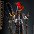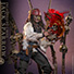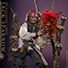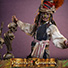 『パイレーツ・オブ・カリビアン/デッドマンズ・チェスト』に登場する、族長として祭り上げられたジャック・スパロウを、全高約30cm、30箇所以上が可動するハイエンドな1/6スケールのフィギュアとして立体化。演じるジョニー・デップの肖像権をクリアしたヘッドは、眼球可動ギミックを搭載し、自由な視線変更によって、まるで生きているかのような存在感を醸し出すことが可能だ。ペレゴストス族のフェイスペイント、皮膚の質感や皺、髭などを再現すべく、一つひとつハンドペイントで塗装が施されている。特徴的なドレッドと三つ編みのヘアスタイルは、ウール素材による植毛と造形を組み合わせて表現しているぞ。ベストやシャツなどの衣服、本革製のベルトといったコスチュームは、ディテールや素材にこだわり抜き、細部に至るまで精巧な仕上がり。羽根や蛇で彩られた頭飾りは、マグネット式で着脱が可能だ。ベルトには、コンパス、鍵の束、赤い石のペンダント、鳥の足のお守りを取り付けることができる。他にもアクセサリーとして、羽根はたき、指が連なるネックレスが付属。指輪まで再現された差し替え用ハンドパーツを使用すれば、独特のユーモラスなポーズやバトルシーンを楽しめるぞ。ペレゴストス族をイメージした台座は、串刺しのドクロなどが造形されたジオラマ仕様。骨の玉座をデザインしたバックボードが付くのも嬉しいポイントだ!