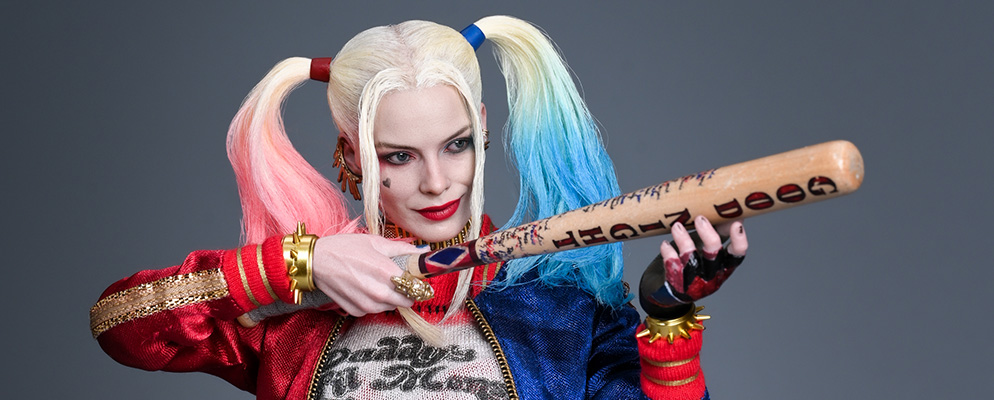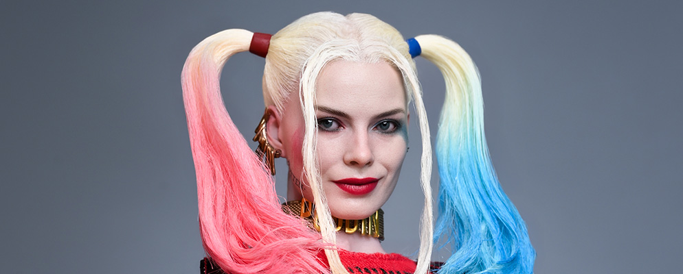 『スーサイド・スクワッド』に登場するハーレイ・クインを、全高約30cm、30箇所以上が可動するハイエンドな1/6スケールのフィギュアとして立体化。新規開発となる、演じるマーゴット・ロビーの肖像権をクリアしたヘッドは、眼球可動ギミックを搭載。自由な視線変更によって、まるで生きているかのような存在感を醸し出すことが可能だ。毛先がピンクとブルーに彩られたブロンドのツインテールは、ウール素材による植毛仕様でリアルに表現。特徴的なメイクやタトゥーなどを再現すべく、一つひとつハンドペイントで塗装が施されている。随所にタトゥーが施された、関節がシームレスとなるシリコン素材のボディは、新規で開発。より自由な可動を実現できる、特殊な金属の骨組みを採用しているぞ。レッドとブルーのツートーンのカラーリングが特徴的なコスチュームは、着脱できるブルゾン、つぎはぎだらけのTシャツ、ホットパンツ、網タイツなど、ディテールや素材にこだわり抜き、細部に至るまで精巧な仕上がり。ゴールドのチョーカーやブレスレットといったアクセサリーまで、忠実に再現している。武器として、バット、ハンマー、スピードローダー付きのリボルバーが付属。リボルバーは肩から下げたホルスターに収納可能だ。また、ショーウィンドウを割って入手したシルバーのハンドバッグが付属するのも嬉しいポイント!多彩な差し替え用ハンドパーツを併せて使用すれば、様々な劇中シーンを演出できるぞ。ジオラマ風の台座は、ガラスの破片などが造形された特別仕様だ。